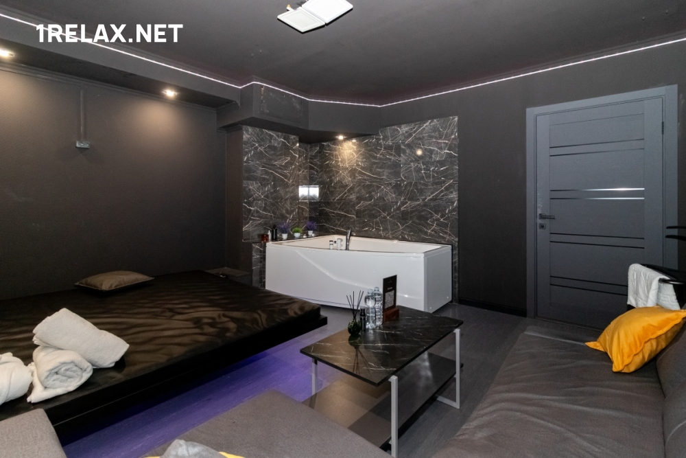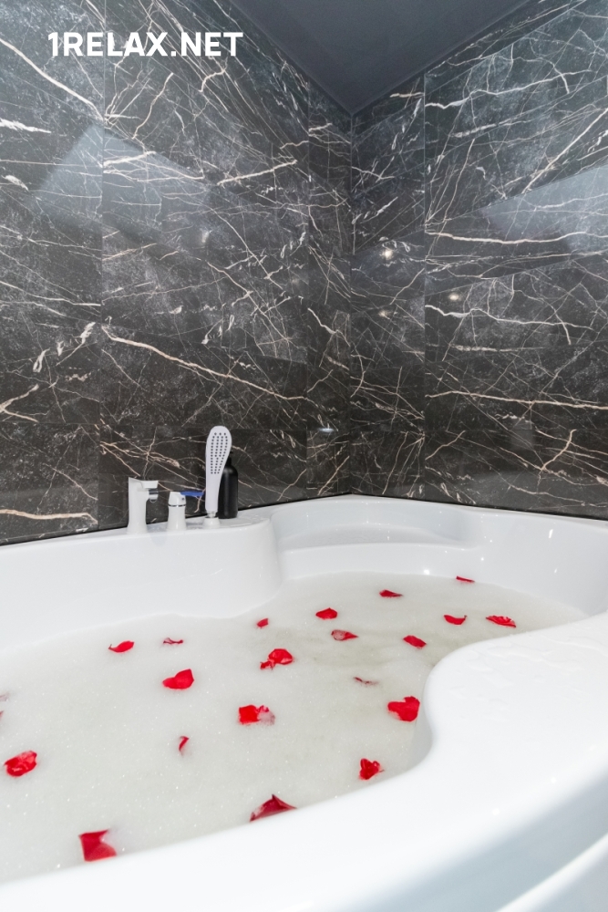 В массажном салоне пять уютных комнат. Интерьер с первой секунды погружает гостя в состояние наслаждения и отдыха. Негромкая музыка, приглушенный свет, танцующее пламя свечей, изысканное постельное белье — все настраивает на удовольствие. В каждой комнате есть удобная кровать, татами, джакузи, телевизор, диваны, столики и кондиционер.